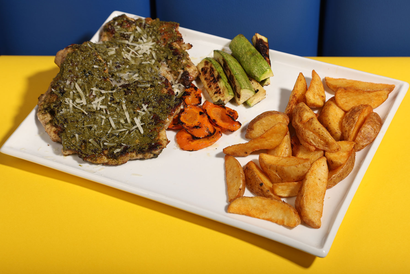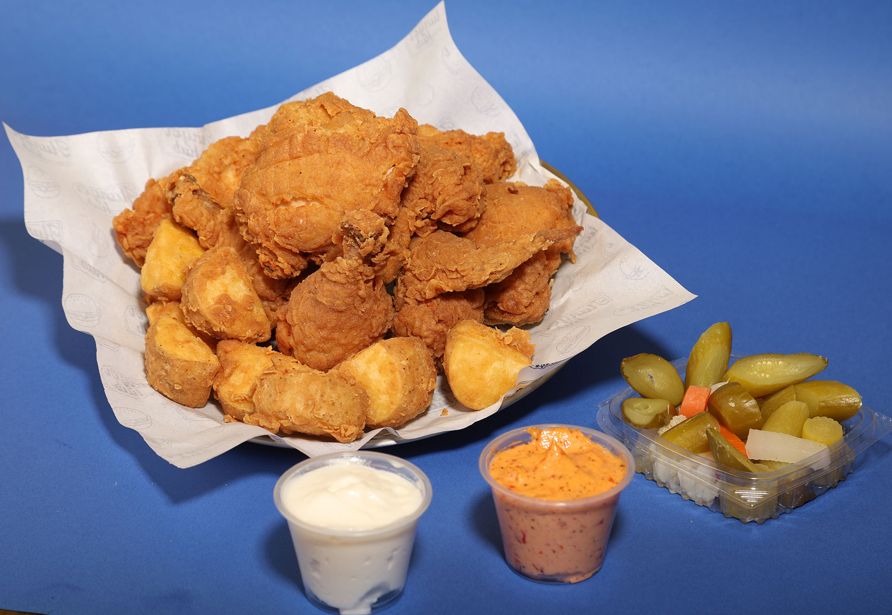 Potato wedges, 2 types of chicken strips, mozzarella sticks, chicken wings, jalapeño cheesy poppers, garlic bread cheesy balls