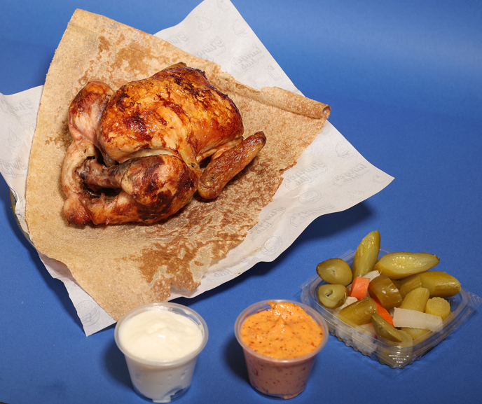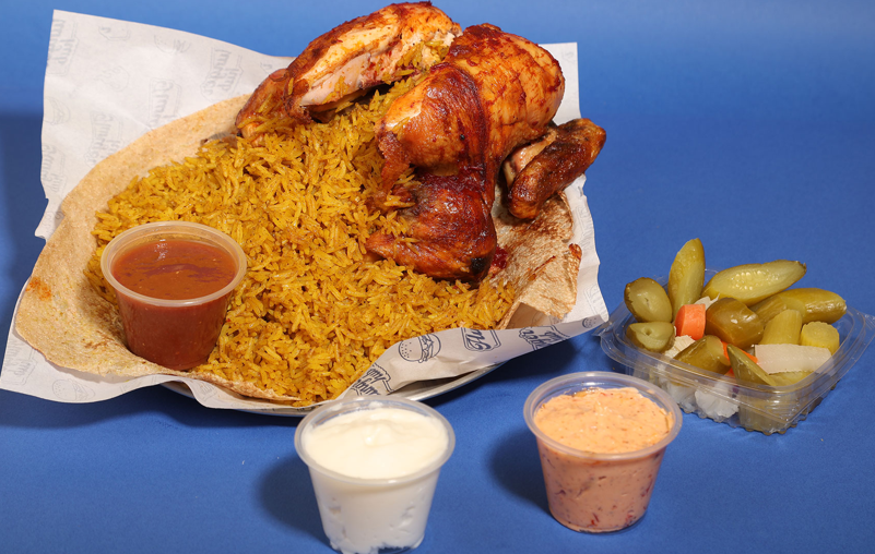$ 7Tawook, coleslaw, fries, pickles, garlic, ham and cheese, special red sauce.