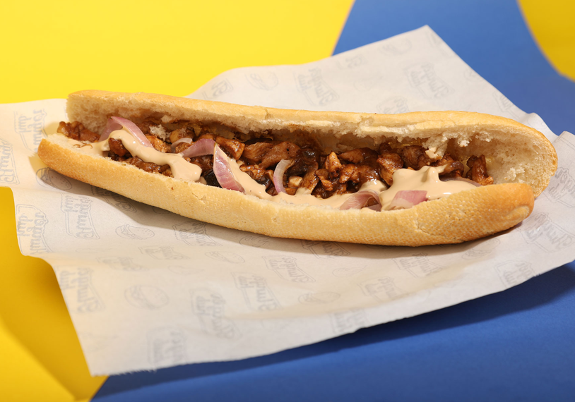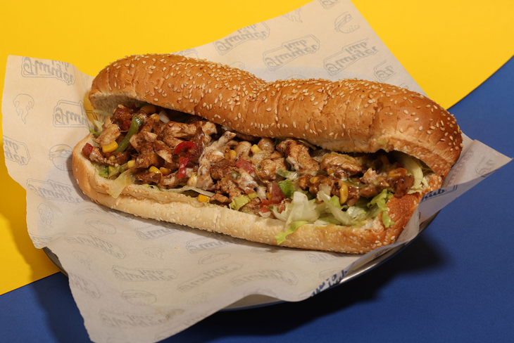 Marinated chicken, bell pepper, onions, melted cheese, guacamole sauce, mayonnaise, submarine bread.