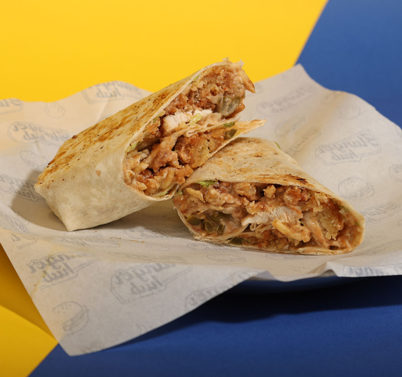 Deep fried breaded chicken dipped in Louisiana sauce, lettuce, chips, ranch sauce, cheddar sauce, barbecue sauce, jalapeño