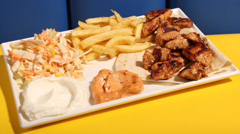 Tawook, coleslaw, fries, pickles, garlic, ham and cheese, special red sauce